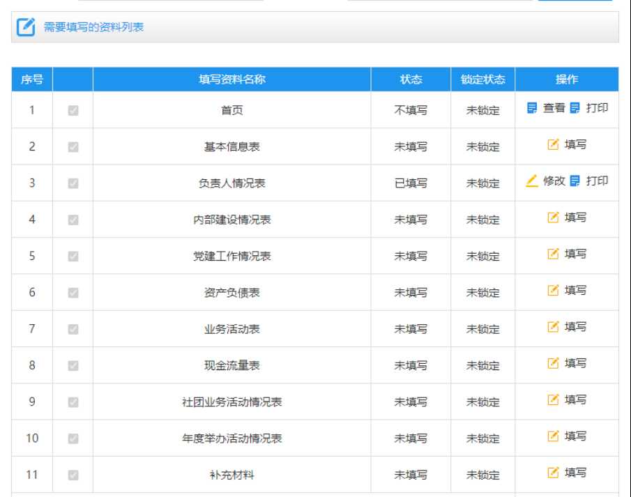 进入年检系统后,如实填报《年检报告书》,请确认每页的填写状态,除“不填写”的页面,其余页面状态为“已填写”,方能提交。