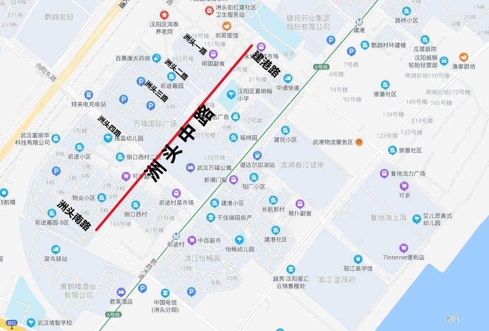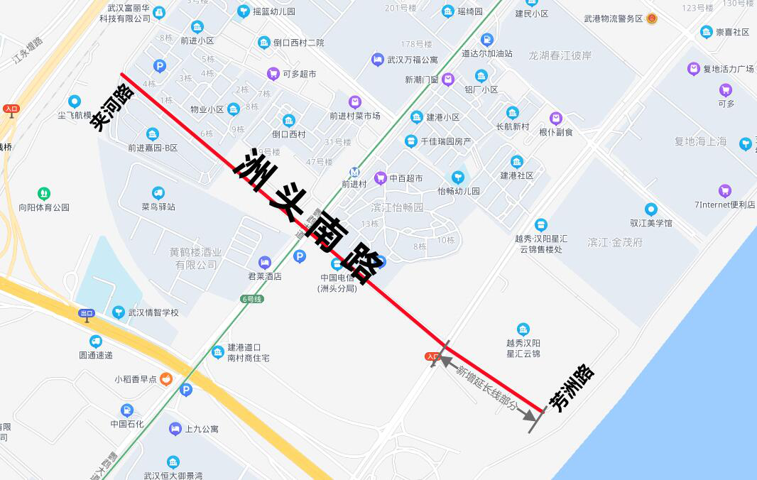 地处汉阳区洲头街道办事处辖区,新港西路东北,紧邻复地·海上海小区东北侧,东南起芳洲路,西北至晴川大道。长约300米,宽约20米。因该道路为已命名的“建港路”向东南端延长线,为保持道路连续性,故名。延伸后,该道路西北起于夹河路,东南止于芳洲路,全长约1200米,宽约20米。