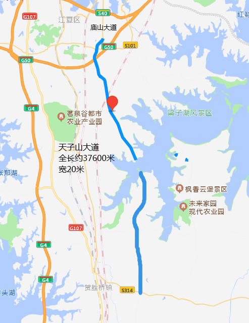 位于江夏区庙山高新技术产业园、纸坊街道、乌龙泉街道、山坡街道、湖泗街道辖区。南北走向,北起庙山大道,南至314省道,其中途径梁子湖处因梁子湖水面大桥还未修建暂未全线贯通。全长约37600米,宽约50米。沥青路面。因途径爱国主义教育基地天子山,故名。