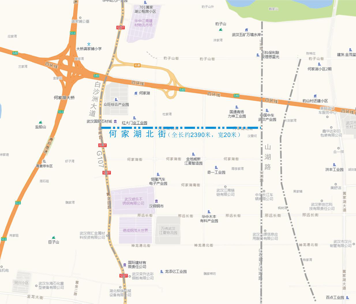 位于江夏大桥现代产业园辖区。东西走向,西起白沙洲大道,东至山湖路。全长约2390米,宽约20米。沥青路面。因位于何家湖街北侧,故名。