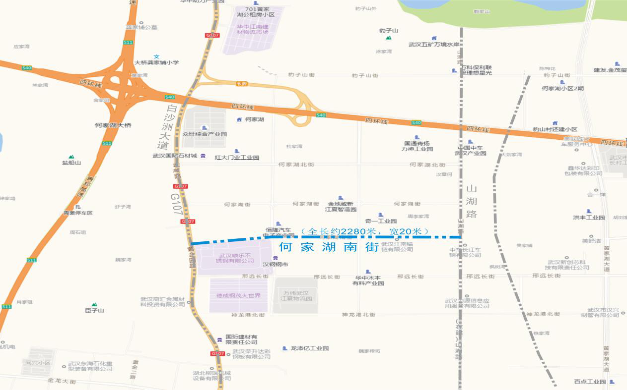 位于江夏区大桥现代产业园辖区。东西走向,西起白沙洲大道,东至山湖路。全长约2280米,宽约20米。沥青路面。因位于何家湖街南侧,故名。