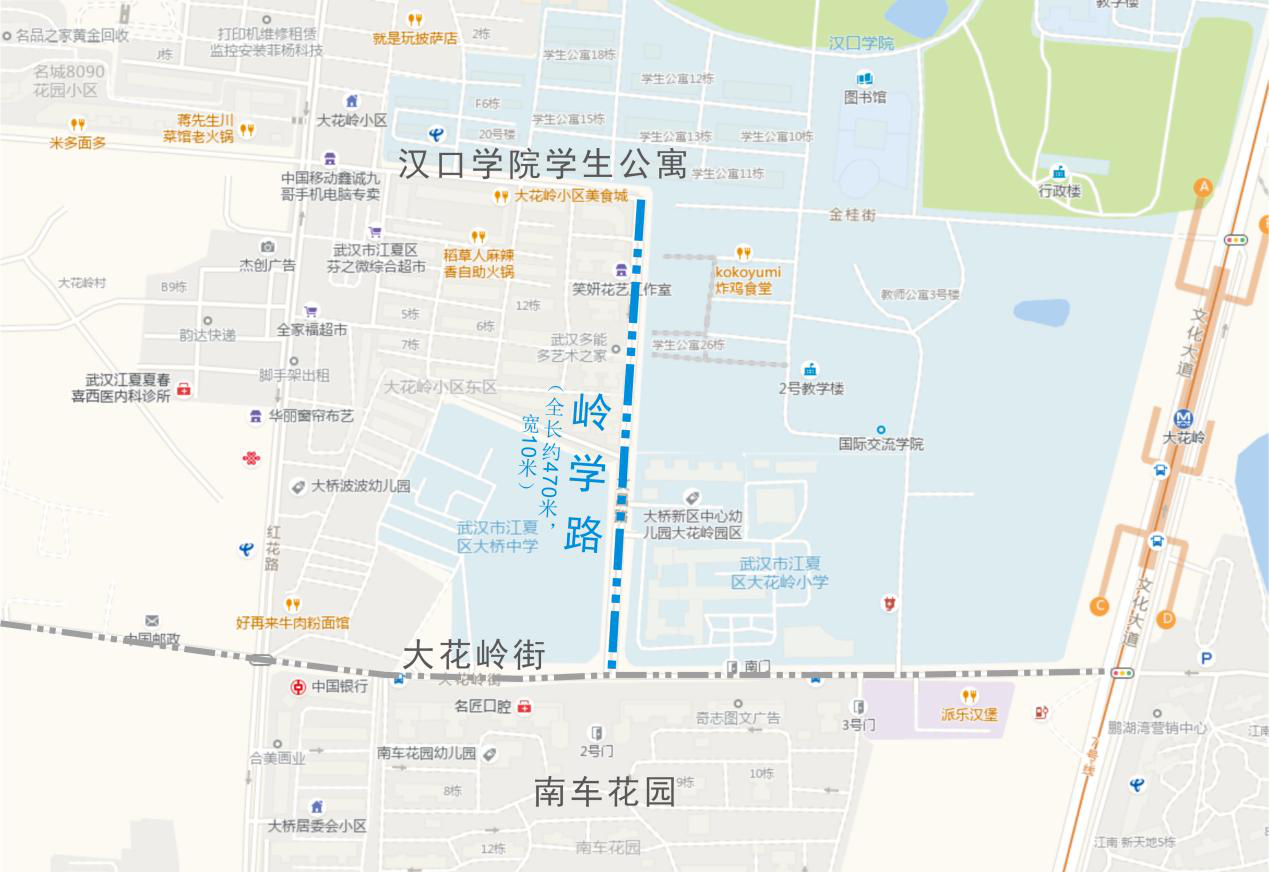 位于江夏区大桥现代产业园辖区。南北走向,北起汉口学院学生公寓,南至大花岭街。全长约470米,宽约10米。沥青路面。因两侧为大花岭中学和小学,故名。