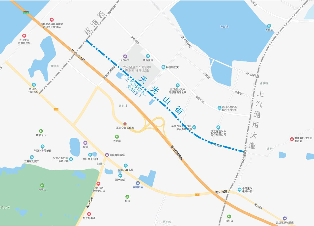 位于江夏区金港汽车产业园辖区。西北起疏港路,东南至上汽通用大道,途径武汉金港汽车零部件产业园。全长2612米,宽约40米,沥青路面。因沿天光山修建,故名。