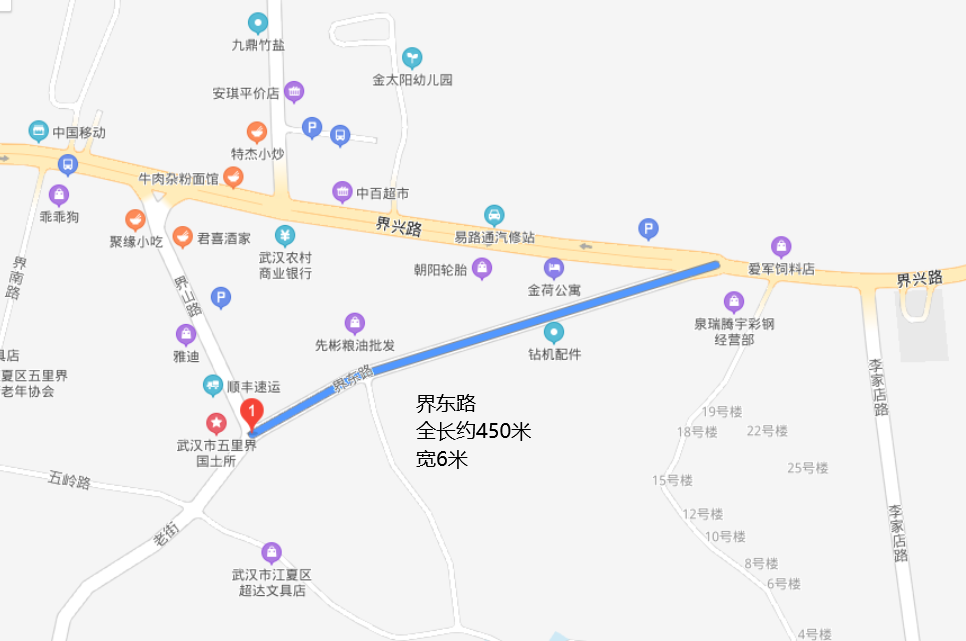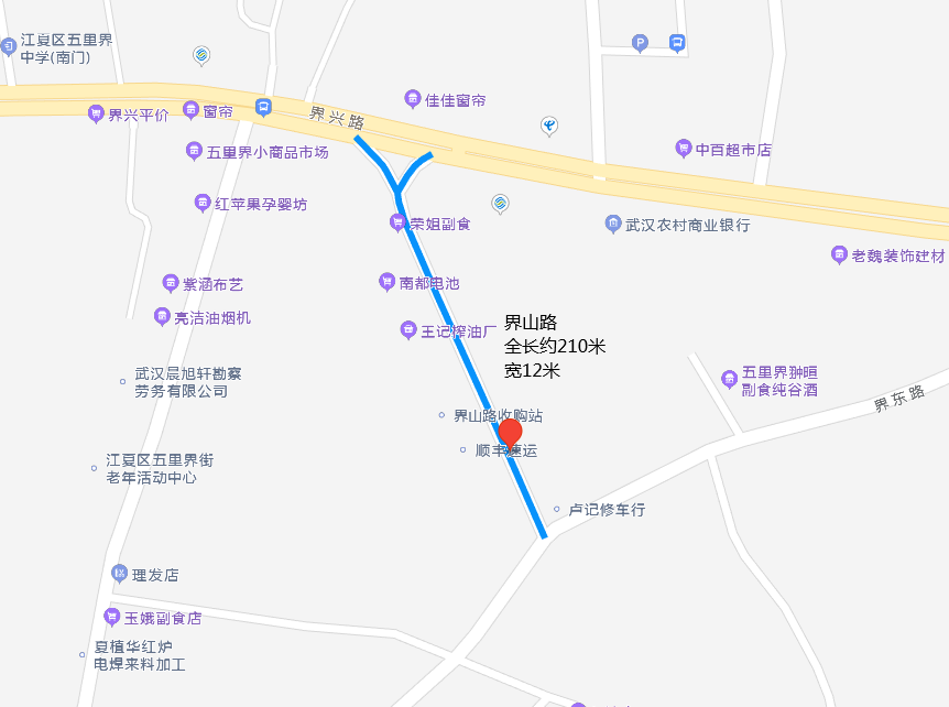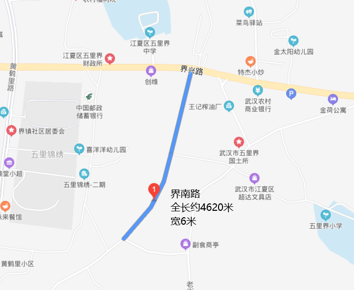 位于江夏区五里界街道辖区。南北走向,北起界兴路,南至界东路。全长约210米,宽约12米。沥青路面。因与界兴路、界东路形成“山”字状,故名。