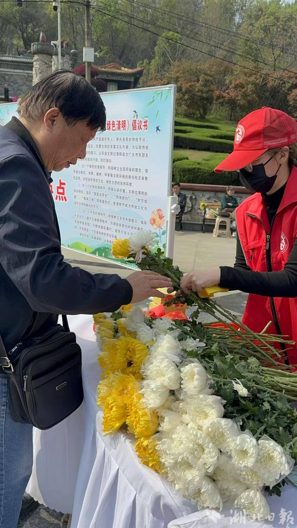 “帮我换两朵菊花,一黄一白。”在园区的鲜花置换点,不少人将纸钱免费置换成鲜花,用一抹花香寄托哀思,成为绿色祭扫的一员。