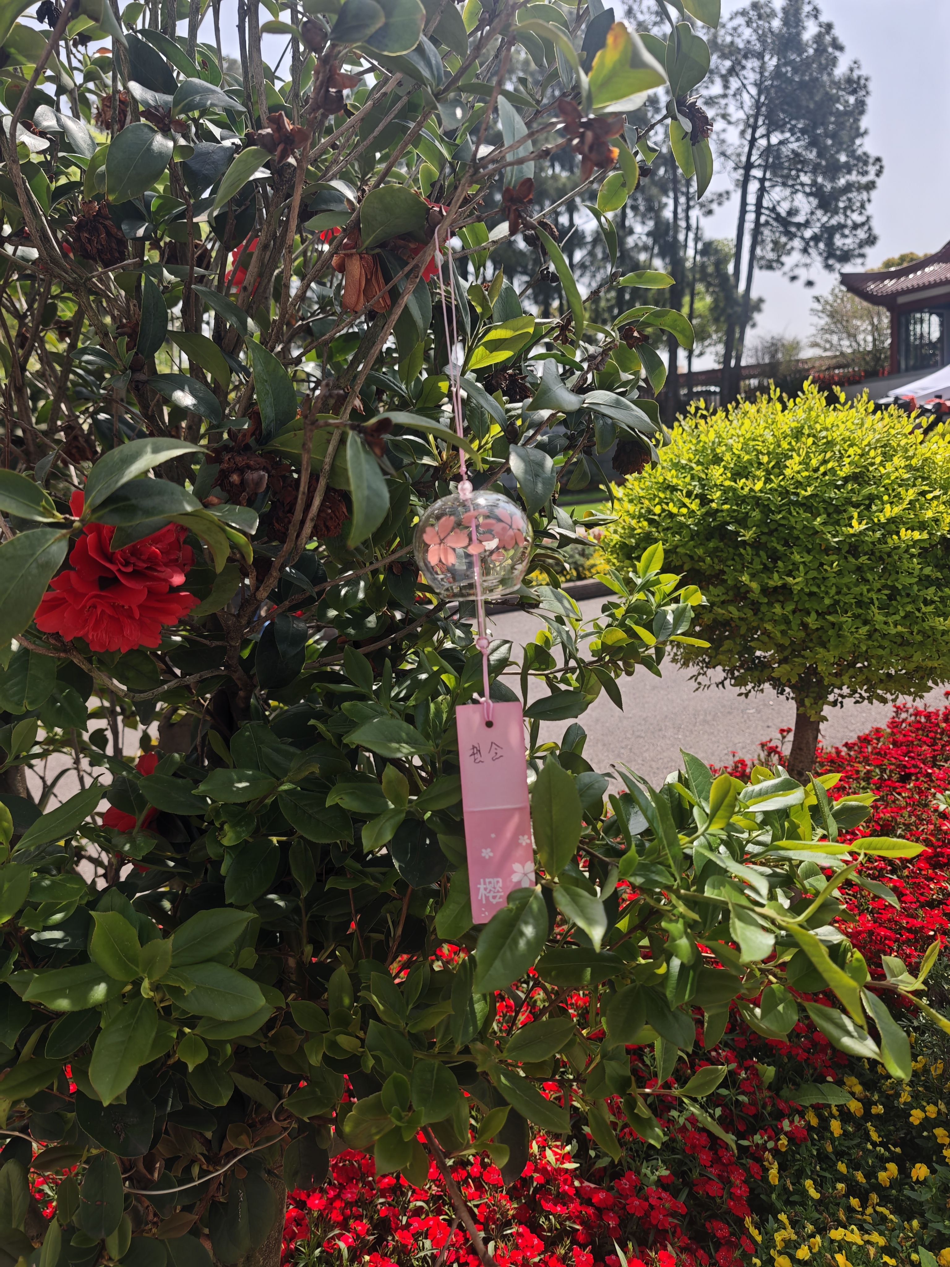 墓区主干道两旁的樱花树上,500个风铃随风摇曳、叮咚作响。据孝恩园工作人员郝利红介绍,“这些风铃都是一周前市民亲手制作的,大家积极配合,认为这种方式雅致又有意义。”除风铃外,孝恩园当日还准备了1000个纸灯笼、500个祈福香囊,供市民亲手制作,挂在亲属墓碑两侧寄托思念。